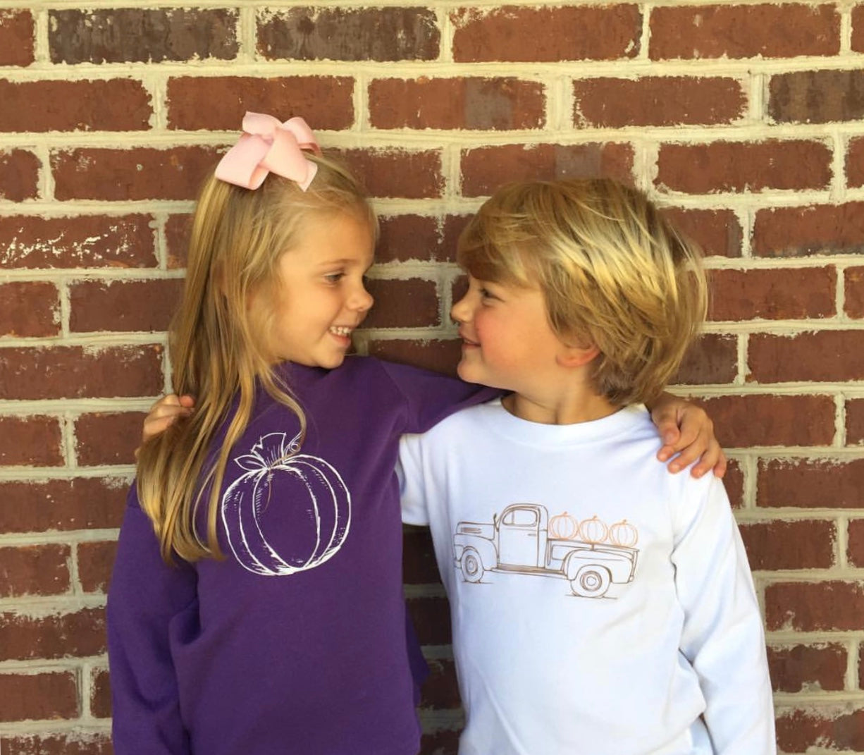 Our swirly pumpkin is available on Purple and Orange. Long Sleeve Monag shirts come in even sizes only; we suggest sizing up if you are between sizes for longer wear.