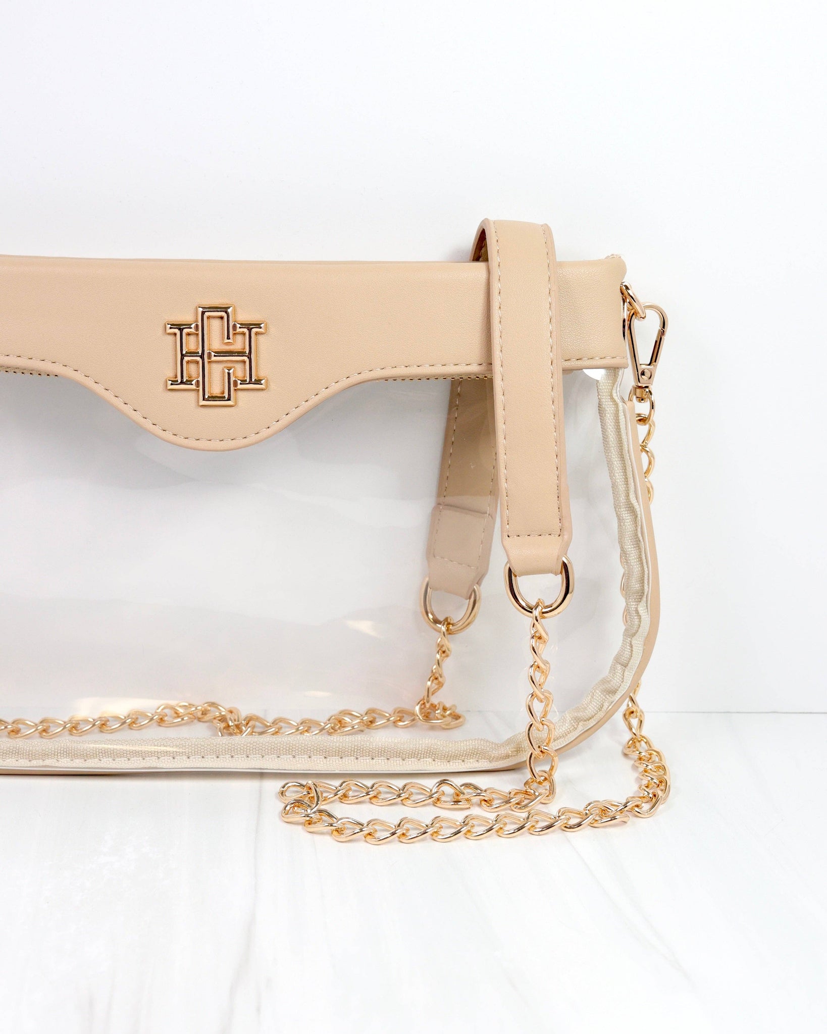 The Madi Clear Crossbody in Nude is the perfect accessory for game day, combining style and practicality. Its transparent design meets stadium requirements, while the chic chain strap adds a fashionable touch. Easily pair it with our purse chains, nylon strap, or Molly Card Holder to customize your look and keep essentials close at hand.