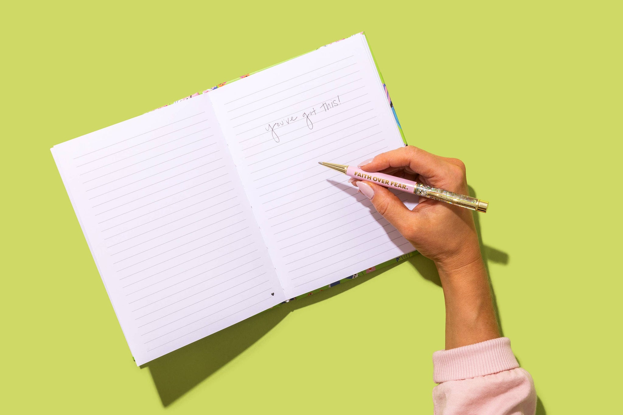 * 1 confetti pen * Imprinted with "Faith Over Fear” * Medium ball point pen * Black ink * Gold metal accents * Confetti inside pen matches our pearl confetti collection * Liquid inside pen is water * Twist pen tip to use * Imported